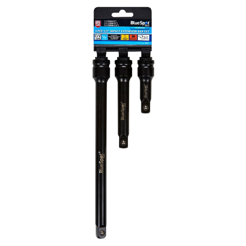 The Blue Spot Tools 3 PCE 1/2" Impact Extension Bar Set is manufactured from heat-treated chrome vanadium with a blackened phosphate coating to protect from corrosion. Spring ball socket retainer is secure and suitable for all types of air impact tools. The set includes 75mm, 125mm and 250mm bars to increase the range and precision of air impact tools.