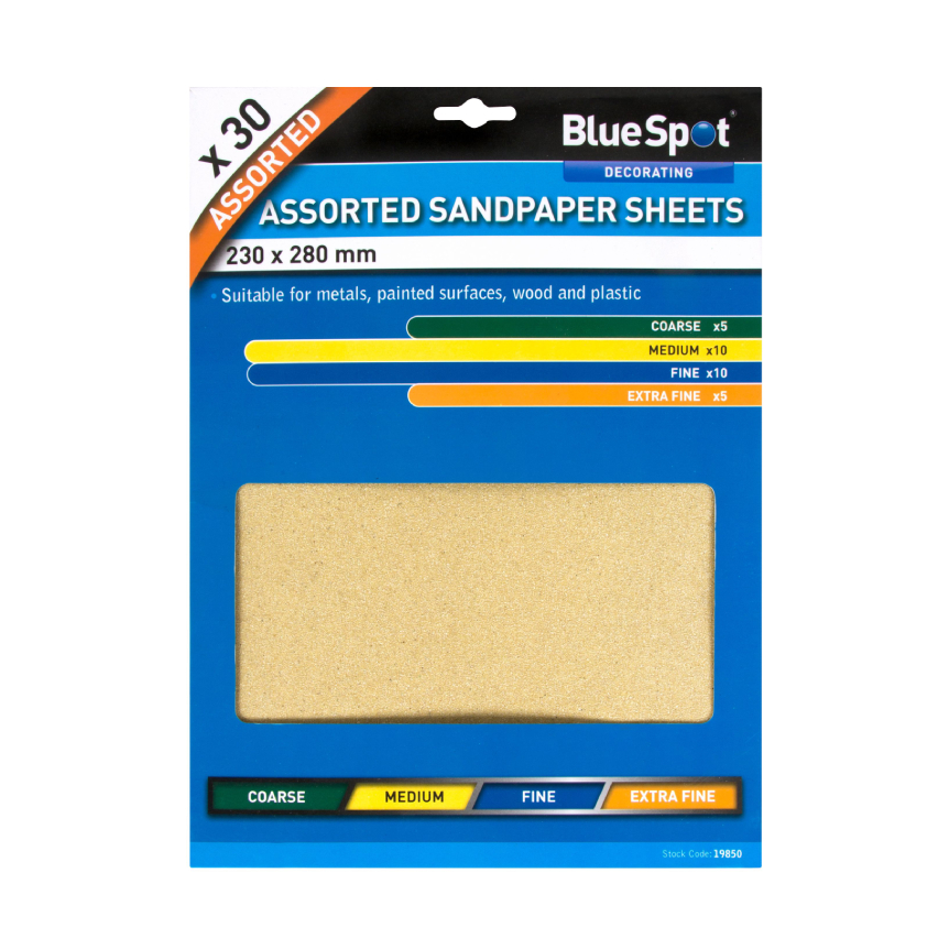 The Blue Spot Tools 30 Piece Assorted Sandpaper Sheets are suitable for use on metals, painted surfaces, wood and plastic. Coarse grit is ideal for paint stripping and rough sanding. Medium grit is ideal for general sanding. Fine grit is ideal for finishing and sanding between paint coats. Extra fine is ideal for final finishing and sanding between paint coats.