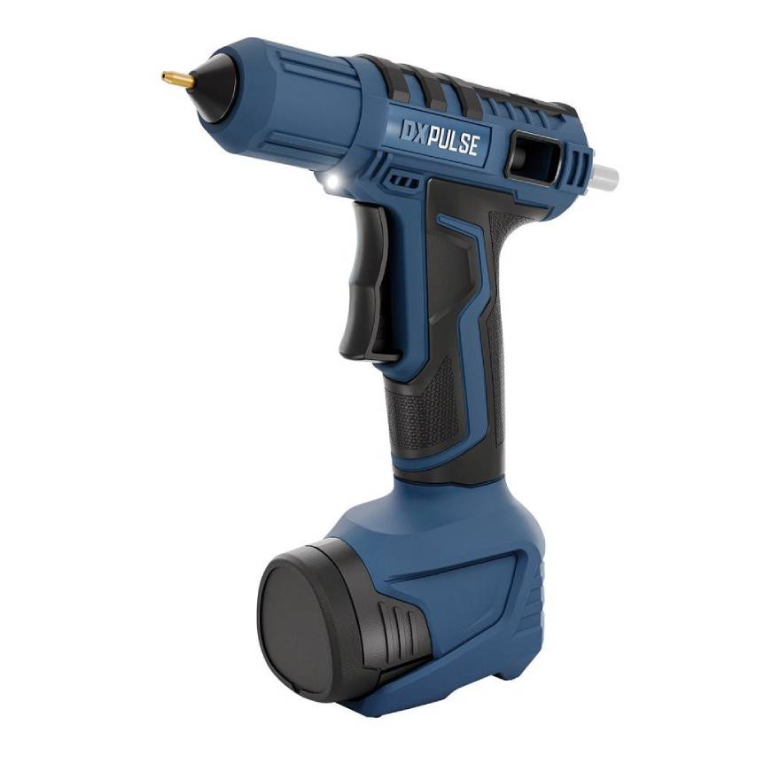 This cordless glue gun is part of the DXPULSE 12V Interchange Series. It is lightweight and compact, equipped with a two-finger trigger for enhanced control and a handy LED worklight.