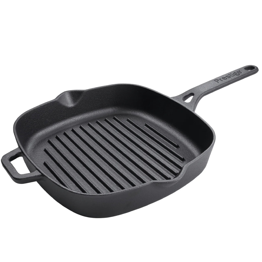 Le Creuset Cast Iron 26cm Signature Square Grillit, the Signature Square Grillit® gives all the delicious flavour of an outdoor grill, with all the convenience of indoor cooking. It produces the most succulent food as cast iron reaches high heat on a low to medium setting and once hot it will stay hot sealing the outside of your food very quickly as you add it to the pan and locking in the maximum amount of moisture, nutrients and flavour. It is a very healthy way of cooking too as the cooking fat drains away and collects below the ribs. Setting the new Signature Square Grillit® apart is its convenient loop handle, added for extra ease of use and stability when lifting a full pan. The grill is coated with Le Creuset's specialist satin black enamel finish. Very durable and easy to clean, the satin black enamel interior has been especially designed to protect the pan (no seasoning is required) and is ideal for searing and grilling foods such as meat, fish and vegetables.