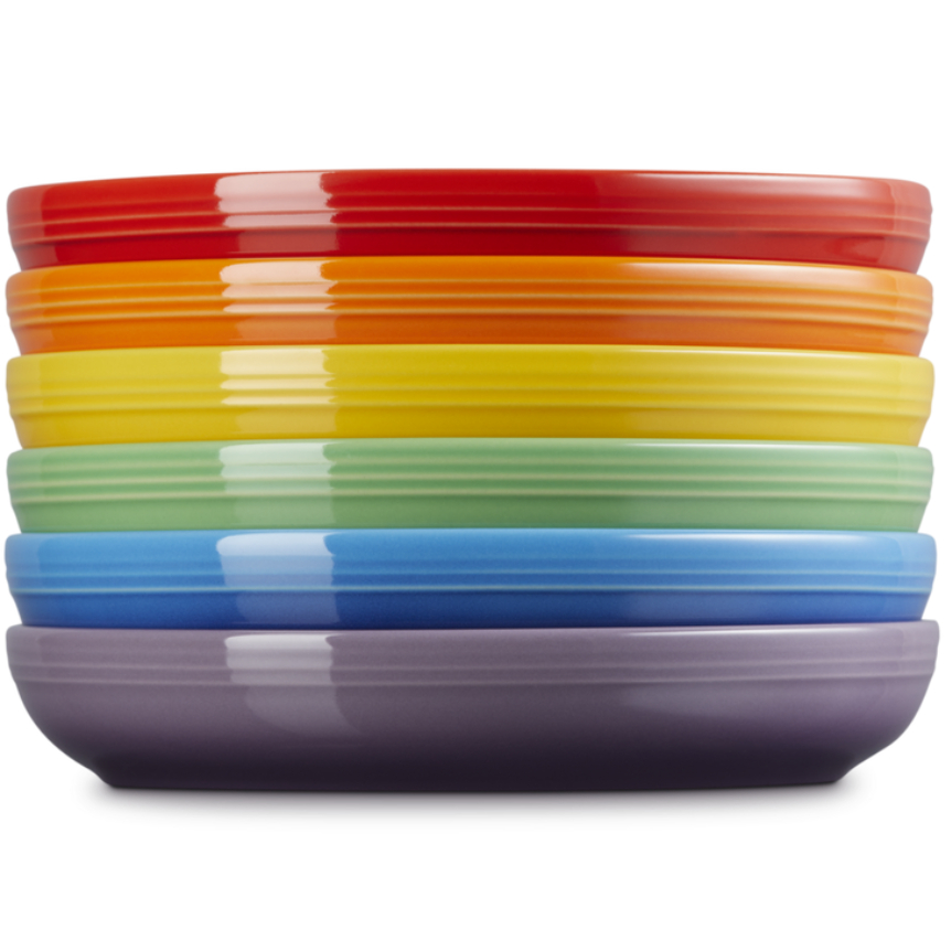 Serve comfort with colour. This set of six stoneware pasta bowls features wide, gently sloping sides ideal for pasta, risotto, salads, or desserts. Each bowl showcases one of Le Creuset's signature rainbow hues, bringing playful sophistication to your table. Gift-ready and beautifully boxed, it’s a vibrant treat for cooks, hosts, or anyone who loves to dine in style.