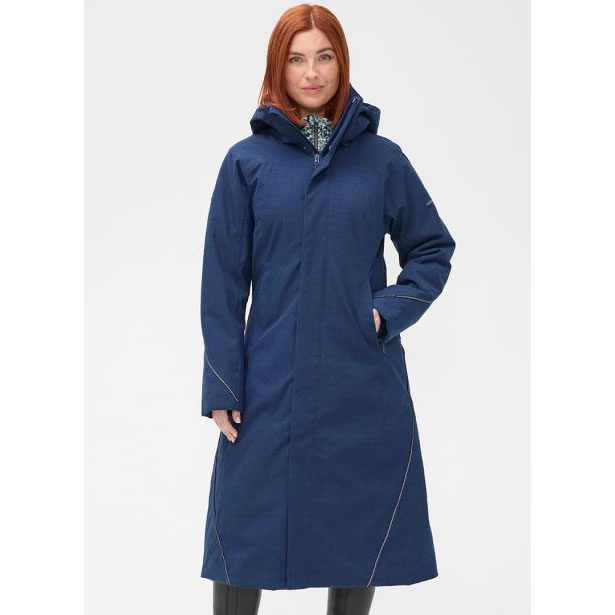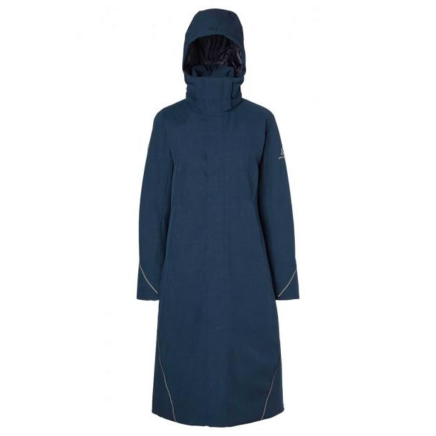 Functional lightweight water- and windproof padded coat with feminine fit. Reflective details at front, back and sleeves. Riding slit at back and detachable hood. Optional adjustable belt at waist