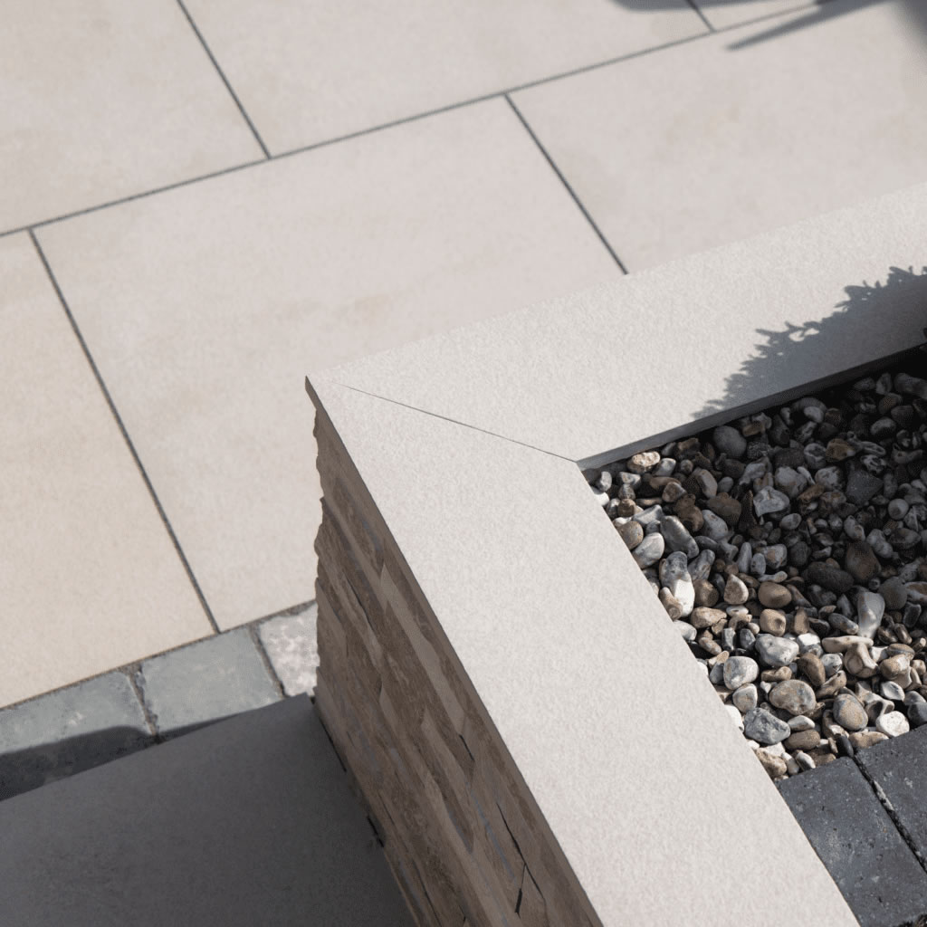 Lucenta is a contemporary mid-grey garden slab with a natural stone quartzite texture, featuring varying tones for an authentic finish. These porcelain edgings can be used to create contrasting borders around paving, adding detail and sophistication to any outdoor space.