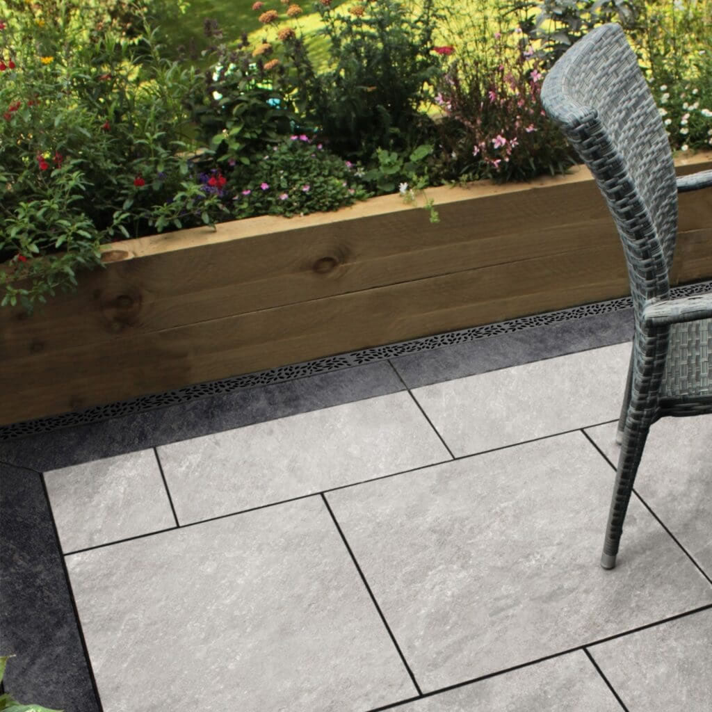 Lustre features a deep shade of quartzite garden slabs with a natural stone quartzite texture, enhanced by dark tones for an authentic finish. These porcelain edgings are perfect for creating contrasting borders around paving and adding detail to your outdoor space.