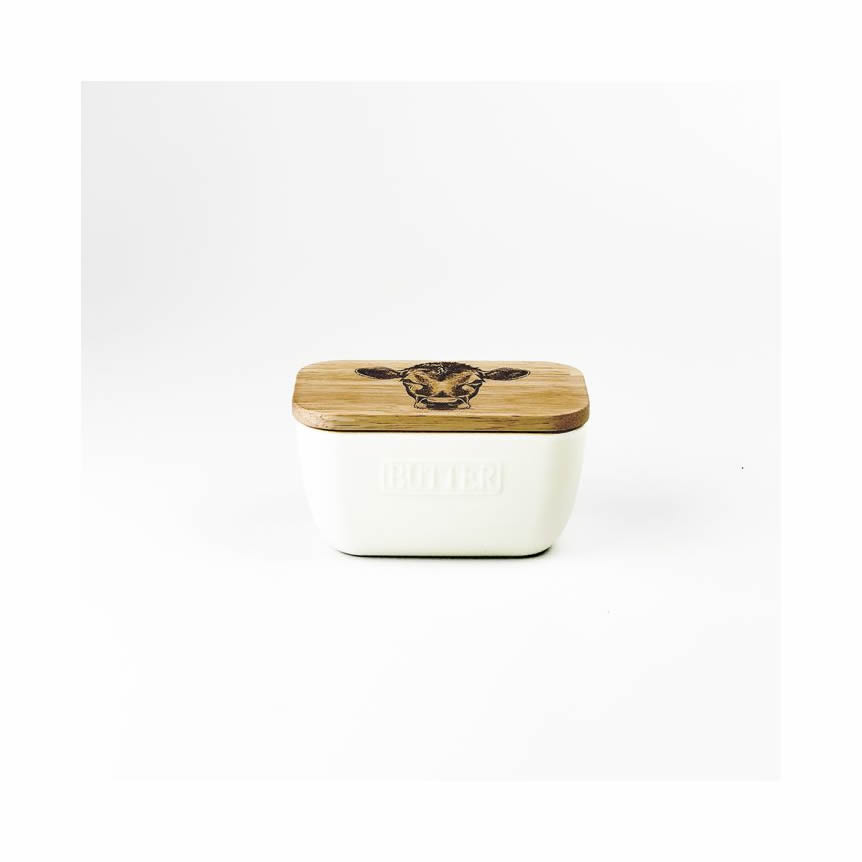 Highland Cow Oak and Ceramic Butter Dish - White