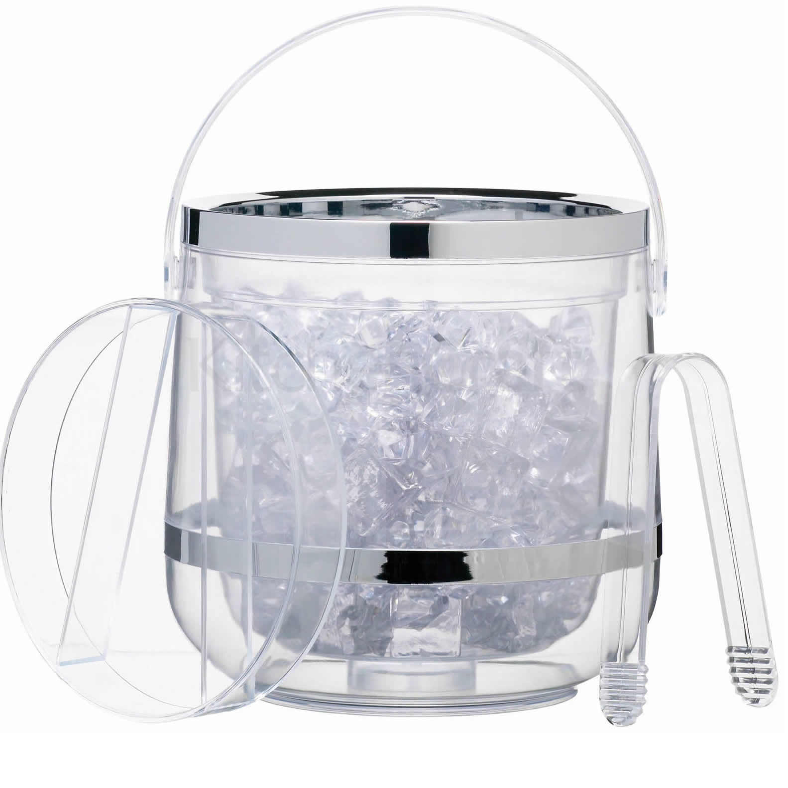 Double walled insulated ice bucket to keep ice cooler for longer. Complete with lid, ice serving tongs, and a useful carry handle. With a clear acrylic finish and stylish polished silver rim.