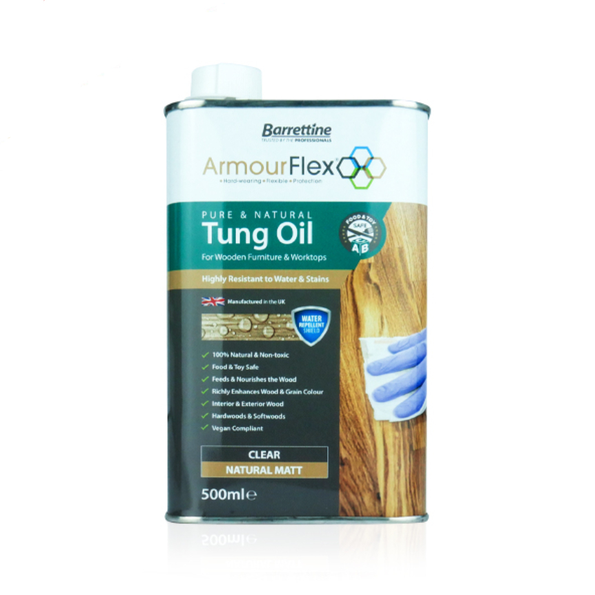 Barrettine's Armourflex Pure & Natural Tung Oil is a completely natural, additive-free oil, ideal for food-safe surfaces like kitchen worktops, children’s toys, and furniture. Pressed from the seeds of the Chinese Tung tree, this wood oil is undiluted by solvents or additives.
