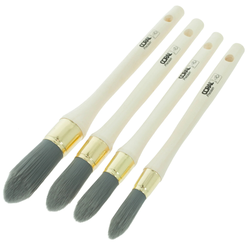 Does your project require brushes that can deliver exceptional control and high-quality results when working on detail areas? Are you looking for a convenient selection of the most useful sizes? The Coral Precision Sash Brush Set 4 Pieces is a superior choice. The pencil-like profile of round, or sash, brushes makes them ideal for reaching into tight areas and intricate details such as those found on traditional sash windows.