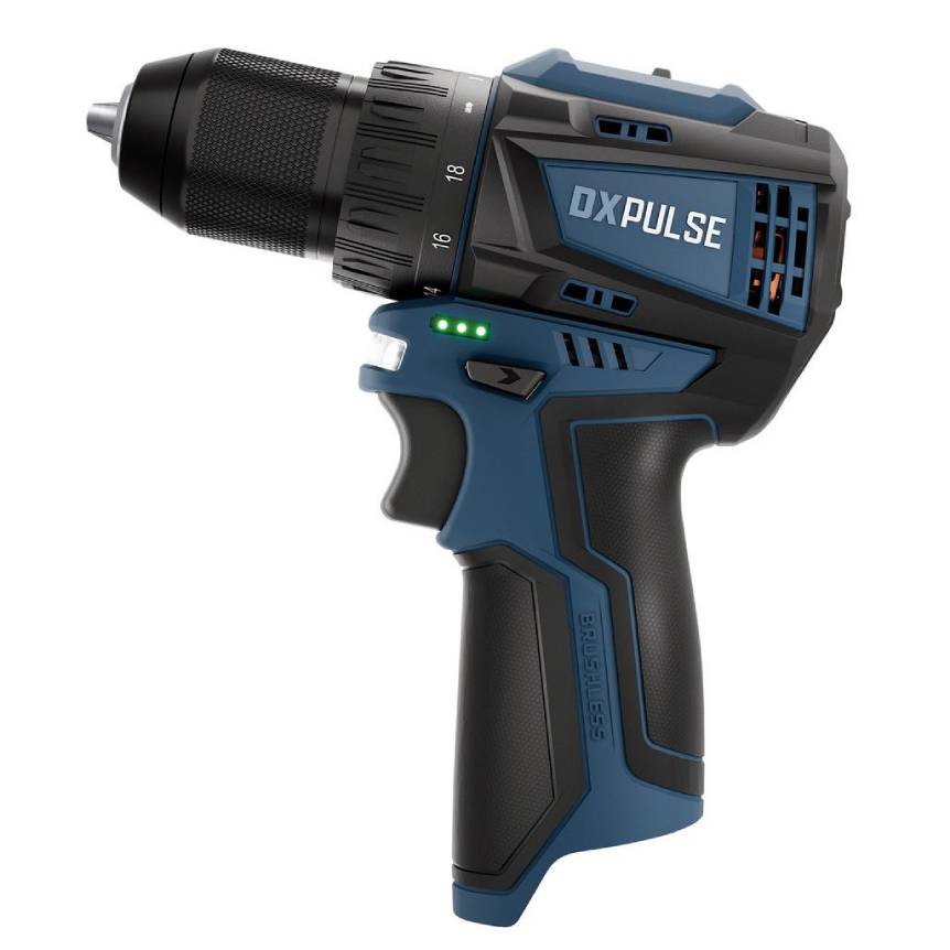 This cordless drill driver is part of the DXPULSE 12V Interchange Series. The brushless motor enhances efficiency, offering more power and a longer battery life. It features a 10mm metal keyless chuck, 18+1 torque settings, forward/reverse, a 2-speed gearbox, a variable speed trigger, and an LED worklight.