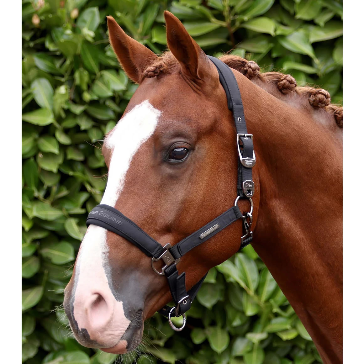Stylish and practical, this head collar is fully adjustable; with buckles both side of the head piece and a single buckle at the curb, complete with a trigger clip throat lash, providing ease of use when putting on and taking off. This horse padded head collar is finished with a metal PE branded badge on the side of the cheek.