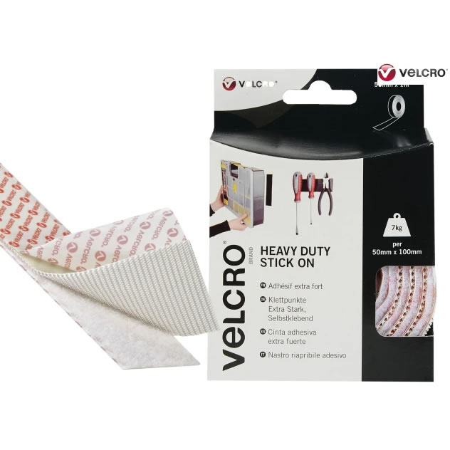 VELCRO® Brand Hook & Loop Heavy-Duty Stick On Tape is the quick and easy to use alternative to nails, screws and glues. With extreme holding power, holds weight up to 7kg per 50mm x 100mm piece (adhesive reaches maximum strength after 24 hours).