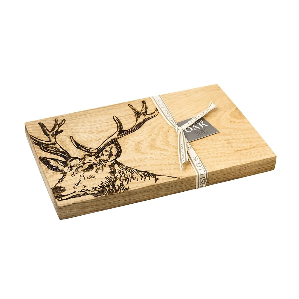 Inspired by Scotland's majestic stags this eye catching stag engraved serving board is every bit striking as it is practical. Our hand crafted 30cm Scottish Oak serving board offers a fun and contemporary way to slice and serve cheese and biscuits to guests after dinner or at more informal gatherings.