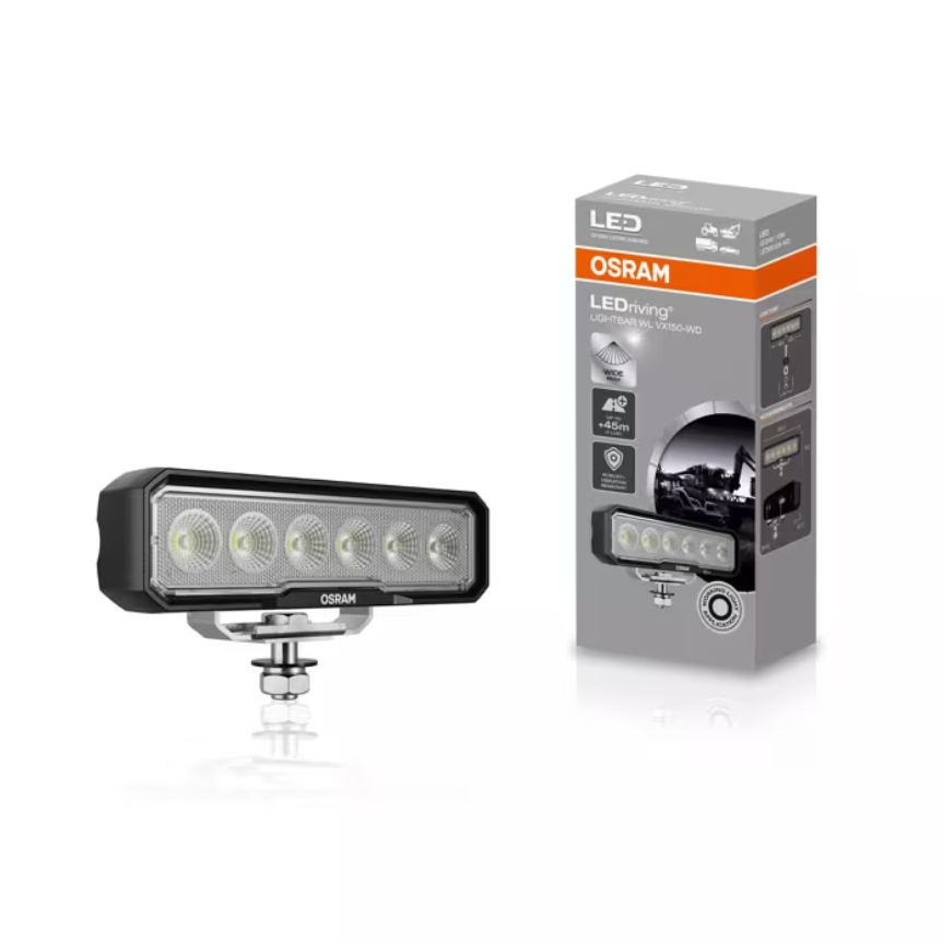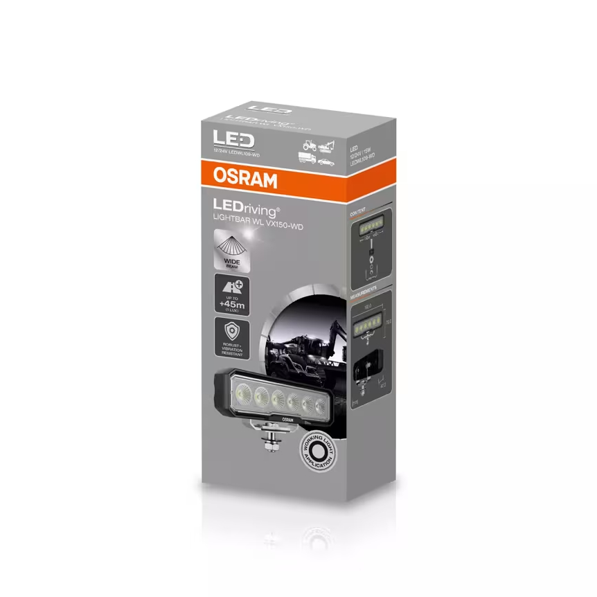 With the OSRAM LEDriving Lightbar WL VX150-WD, you achieve impressive illumination on dark field and forest paths, off-road and off the beaten tracks. The working light combines affordability with exceptional performance, quality and functionality, providing users with impressive visibility at workplaces beyond roads and off-road areas.