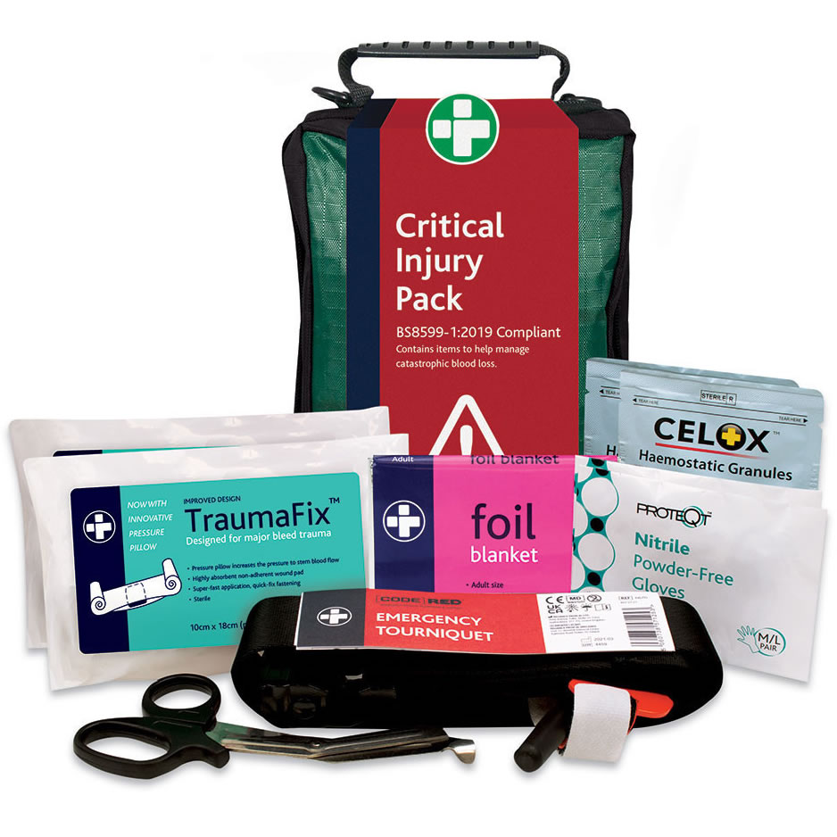 - The Critical Injury Pack is designed to provide immediate, life-saving first aid to someone who has sustained a severe bleeding injury in the workplace. UK Ambulance Services are targeted on reaching a patient within 8 minutes, however, when dealing with catastrophic bleeding every second counts and can mean the difference between life and death. There is nothing in the standard Small/Medium/Large First Aid Kits that be used to stem a catastrophic bleed. Recent Health & Safety Executive guidance now recommends employers provide Haemostatic Dressings and Tourniquets in their first aid provisions for employees working with an identified risk of obtaining severe bleeding injuries.