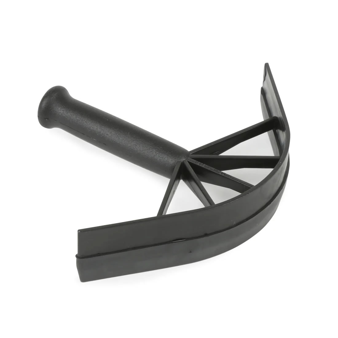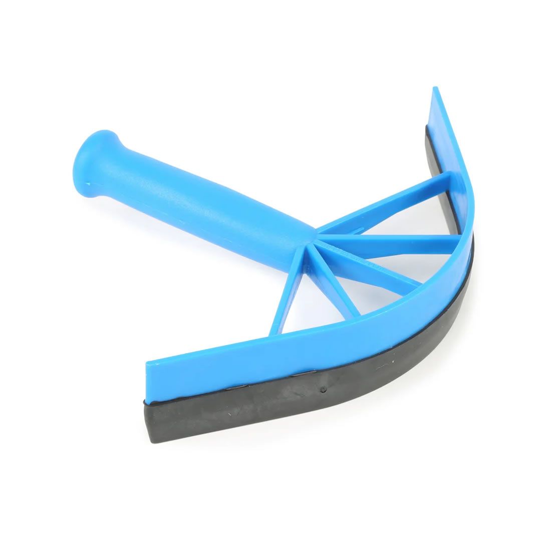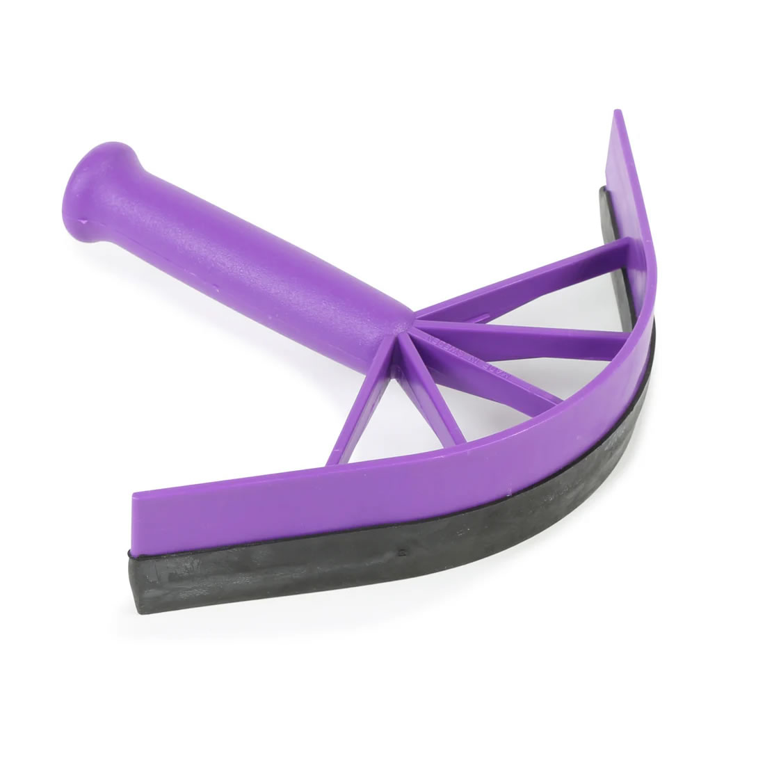 Sweat scraper with plastic body and rubber on one side to remove excess water from the horse's coat.