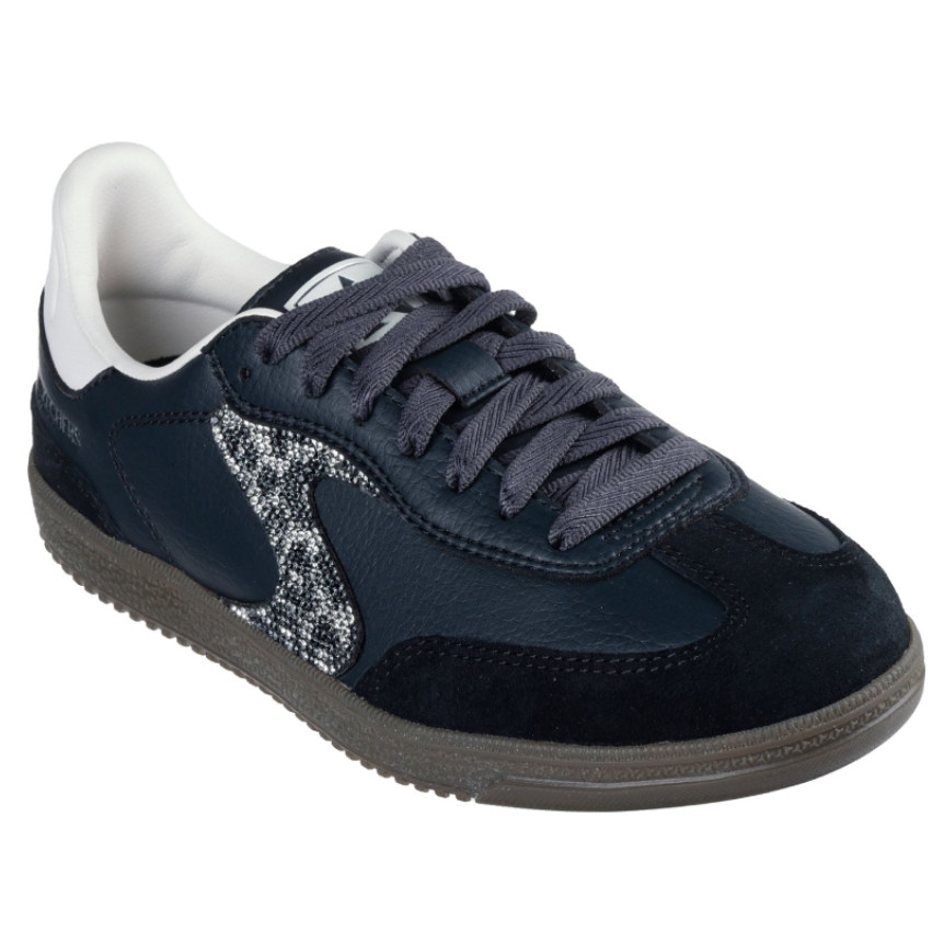 A modern classic meets fresh comfort in Skechers Hotshot Shimmering Spots. This lace-up court-style sneaker features a duraleather upper with pig suede overlays, rhinestone embellished 'S' quarter logo, and a cushioned Air-Cooled Memory Foam insole.