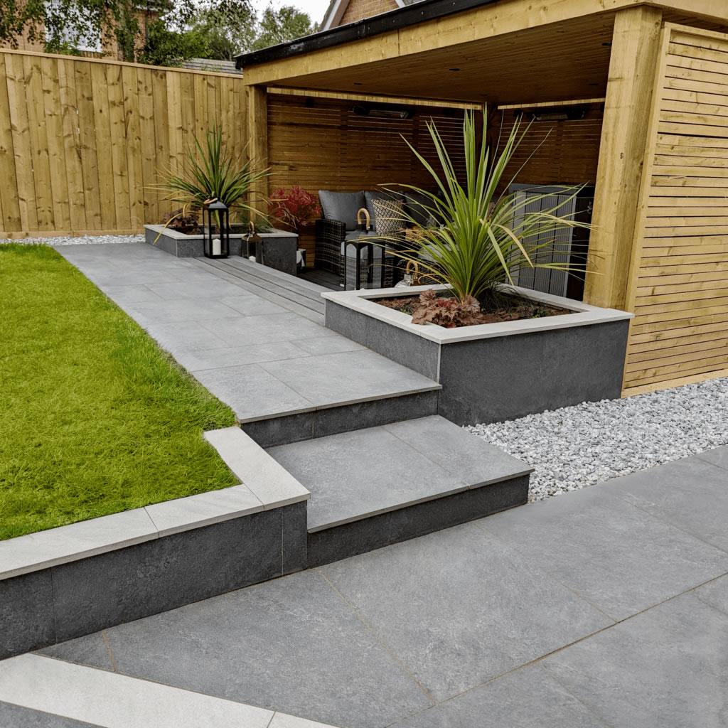 Lago is a deep graphite paving slab with a lightly textured surface that mimics natural stone. Featuring rich dark tones, it adds depth and sophistication to any paved area.