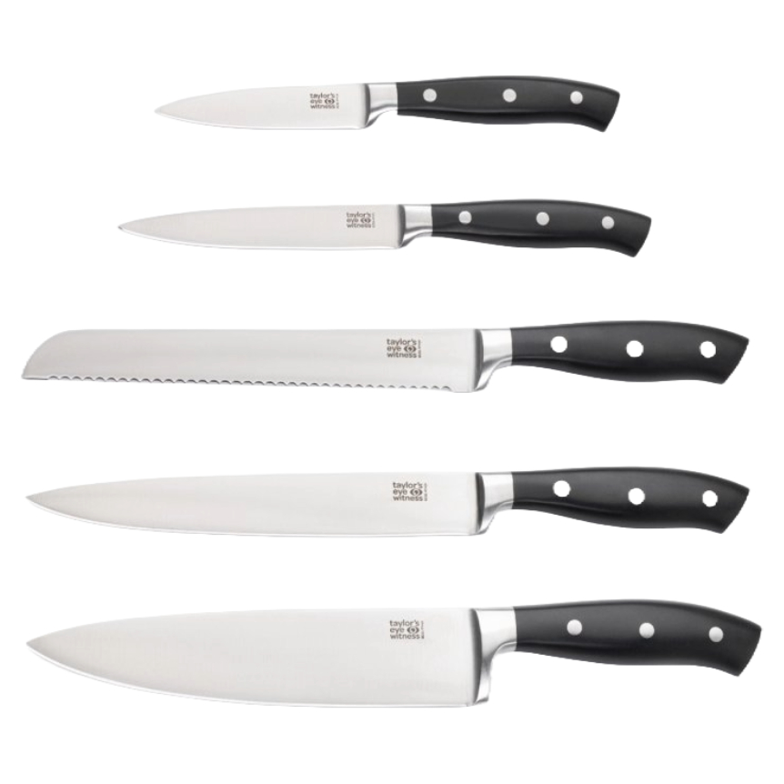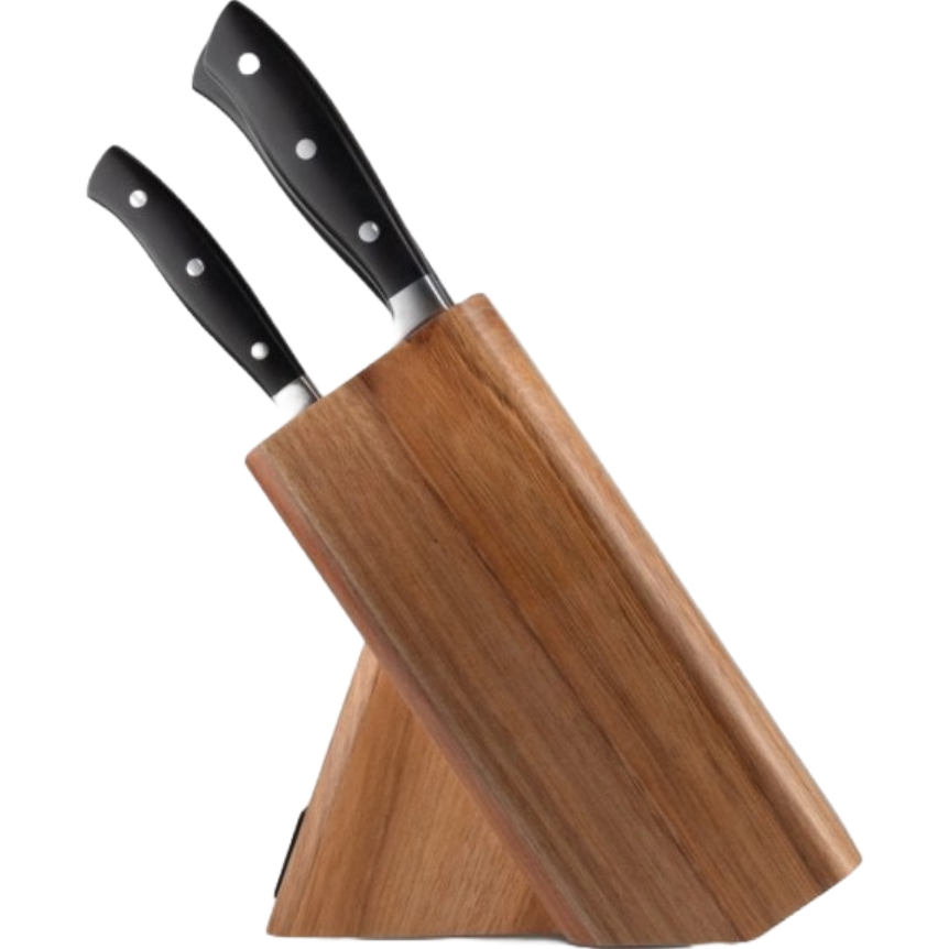 A classic slant knife block made with real acacia wood. With five traditionally made full-tang, triple rivet kitchen knives with precision taper ground blades and a comfortable hand-filling shape. Set includes Paring, All Purpose, Carving, Bread & 20cm Chef's Knives.