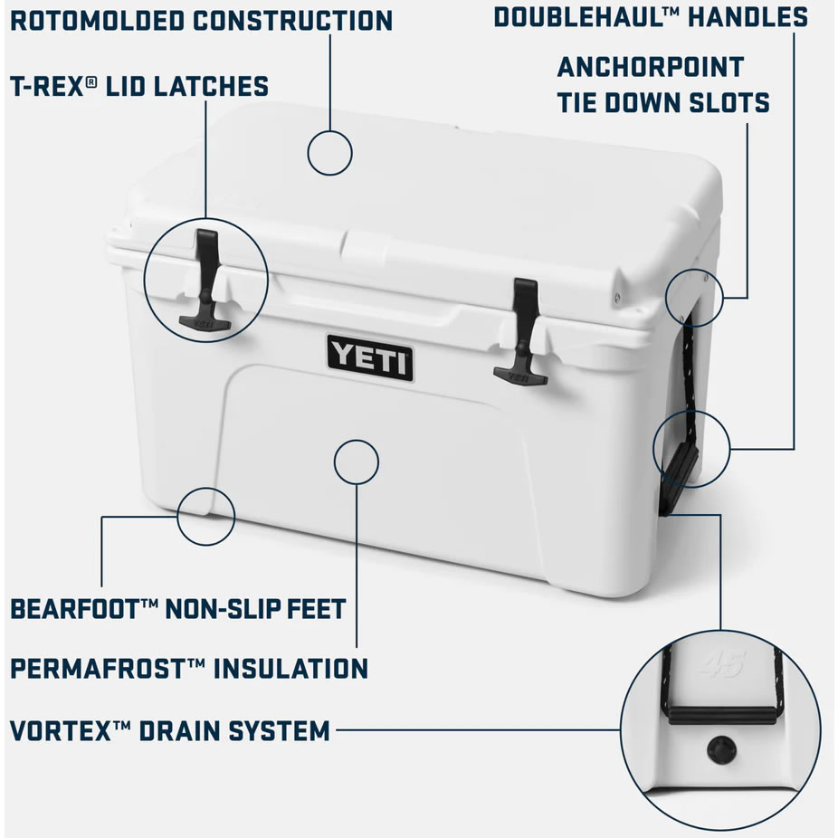 The Tundra® 45 Cooler combines versatility with durability. This premium cooler is infused with that legendary YETI toughness — a durable rotomoulded construction — and up to three inches of PermaFrost™ Insulation. Which is to say it's built to last and will keep your contents ice-cold even in sweltering conditions, or keep your campfire food warm despite the wind chill.