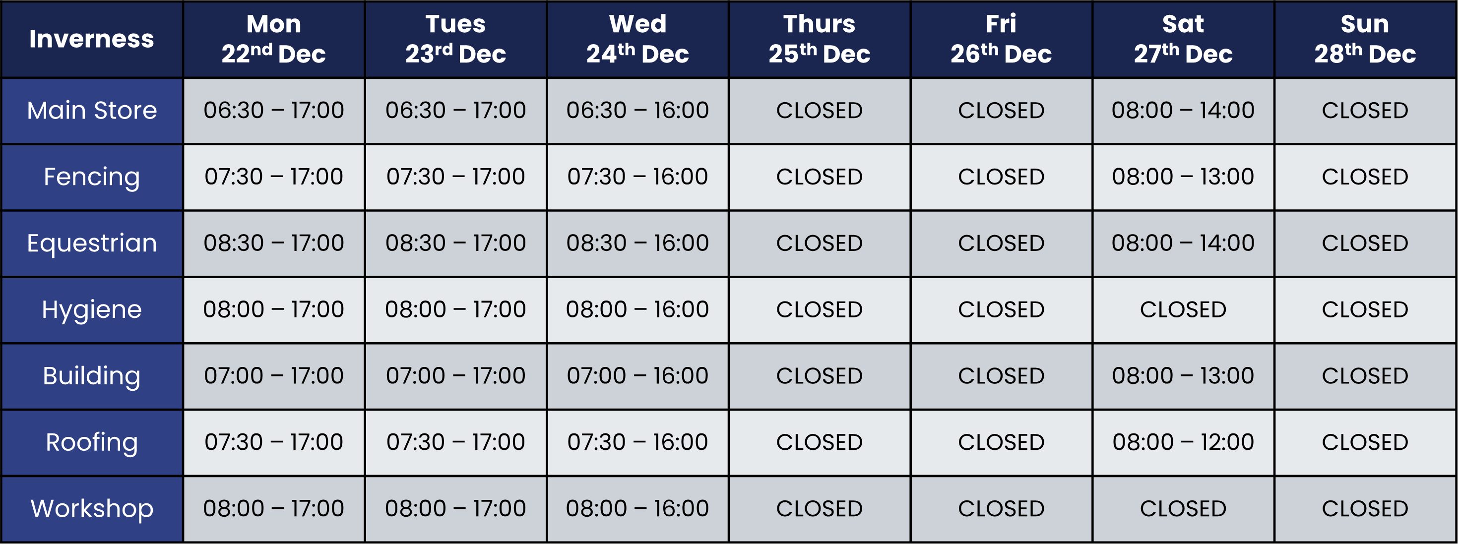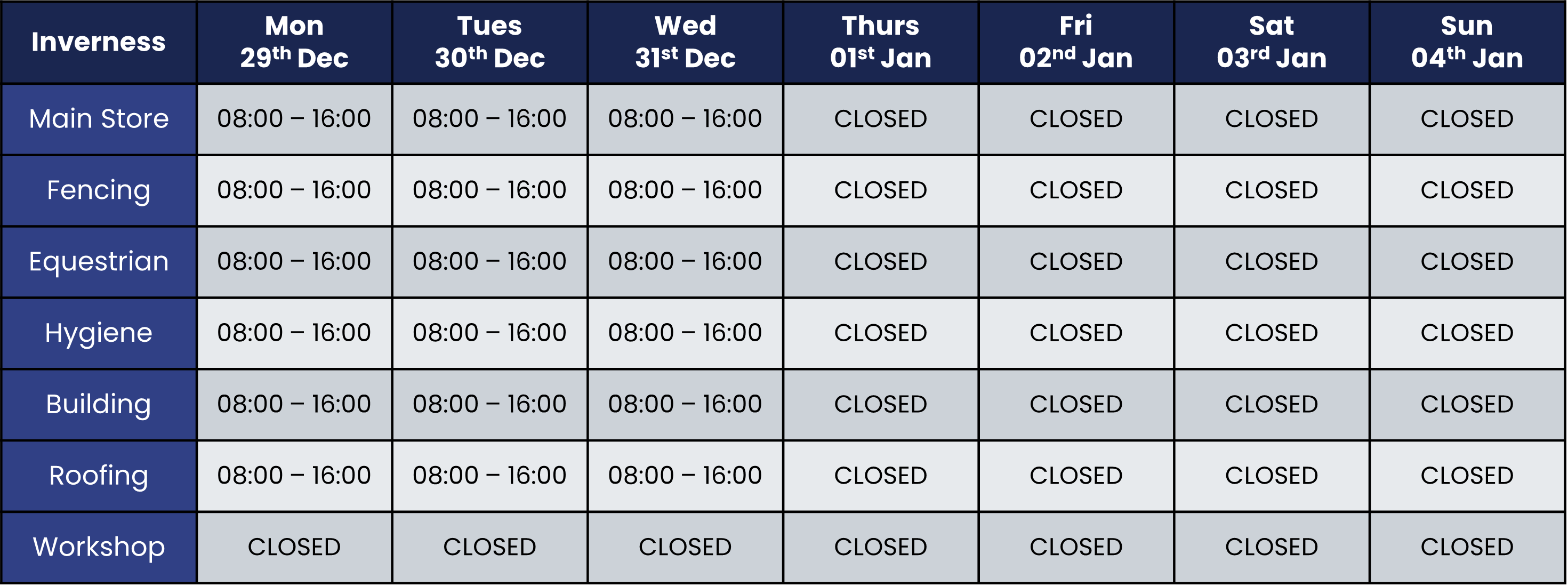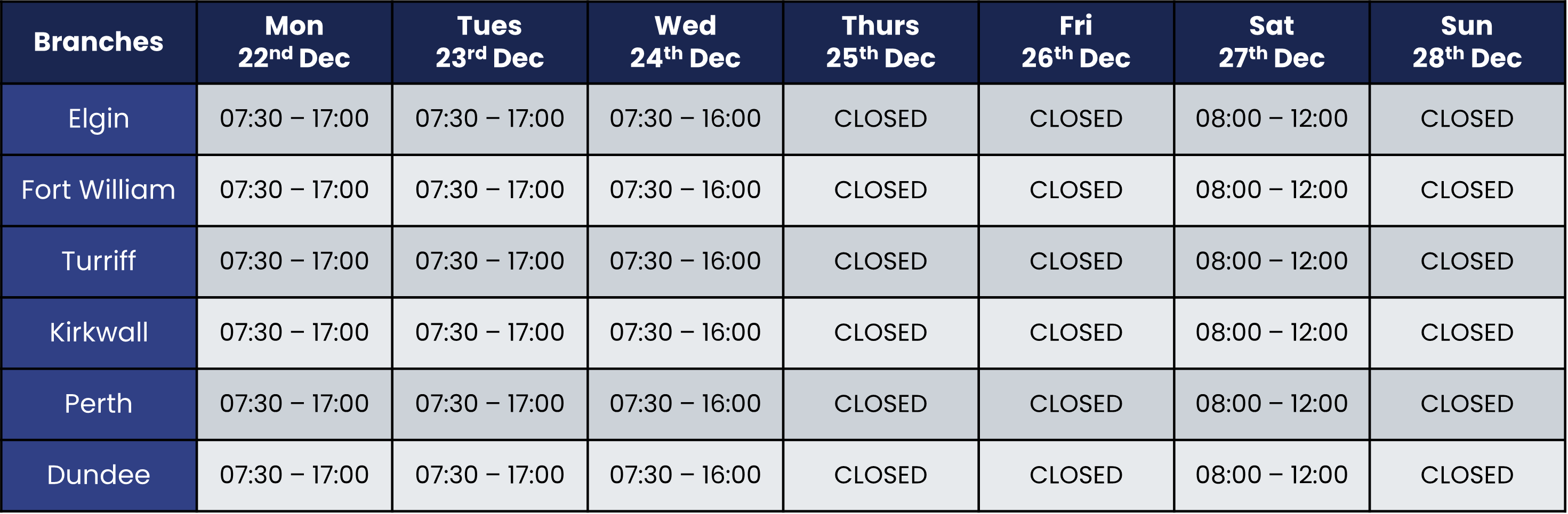 Here at Highland Industrial Supplies Ltd our opening hours are a little different over the holidays, so please check below for your local branch. All of our depots will return to their normal hours on Monday 5th January 2025. To check our regular hours, please look here.